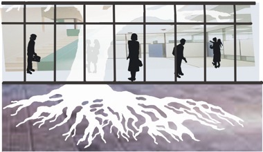 Le choix de l’arbre était en relation avec sa puissance symbolique. Dans toutes les sociétés, en raison de sa verticalité, il représente l’être humain. Il évoque aussi, par son ancrage au sol, sa lenteur à pousser et la structure circulaire du duramen, l’idée du temps et des couches accumulées de vies et de savoir. La métaphore de l’arbre, reliant le passé et l’avenir, l’intérieur et l’extérieur, l’individu et la communauté culturelle, était soulignée dans ma proposition par la double perception qu’offrait l’ensemble de l’arborescence : l’arbre, morcelé par les structures métalliques support des baies vitrées, semblait pousser à l’intérieur de l’établissement, tandis que ses racines s’étendaient à l’extérieur. Le tronc et ses ramifications à l’intérieur renvoyaient ainsi à l’homme en construction, en devenir, en recherche de lui-même, alors que ses racines, sur le parvis (dans la rue), représentaient le passé, les attaches, la mémoire collective, la culture, l’Histoire. Enfin, emblème de l’espèce humaine sans distinction ethnique et sans opposition générationnelle, sa figure fédère les énergies collectives autour de l’idée d’une nature à la fois protectrice (frondaison/abri) et à sauvegarder.