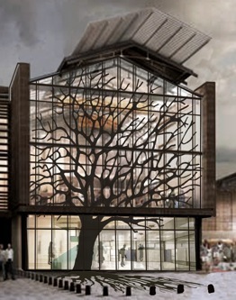 En matière architecturale, l’arbre renforçait l’envol de la façade et celle-ci accentuait en retour sa force symbolique. En outre, le traitement des vitres de façade pouvait permettre de filtrer la vue et la lumière, apportant ainsi un confort supplémentaire aux usagers d’une salle de lecture peu intime sans cette intervention.