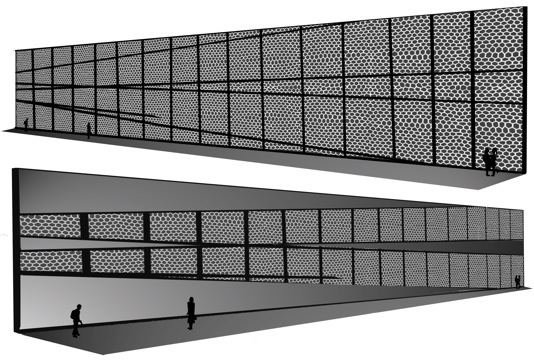J’ai proposé deux formules : l’une composée de panneaux identiques sur toute la surface (E1) et l’autre (E2), qui accentuait la perception des rails avec l’introduction de panneaux pleins (plaques métalliques) recouvrant certaines traverses. Le choix était à débattre en fonction de l’esthétique souhaitée par l’architecte et le maître d’ouvrage, et des coûts de réalisation. L’orientation des voies ferrées était à définir, vers la ville ou vers l’extérieur : les deux sens étant visibles et lisibles, tout dépendait de la signification à privilégier. En outre, le projet évoquait avec légèreté l’idée qu’une salle de spectacles est un lieu de passage, de transit (voies), et d’expression vocale (autre voix) ou musicale (portée).
