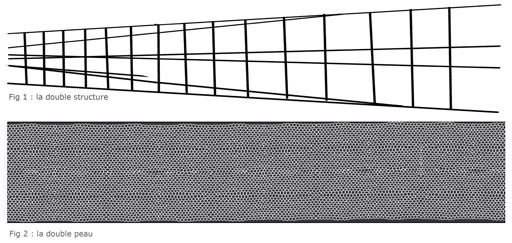 L’œuvre, en acier inoxydable ou en aluminium, pouvait s’intégrer à la peau de cette longue façade ou en constituer le voile animé. Il s’agissait d’un ensemble métallique couvrant toute sa surface et rappelant à la fois l’industrie ferroviaire (voies de chemin de fer) et l’activité dentellière (mailles du point d’Argentan).