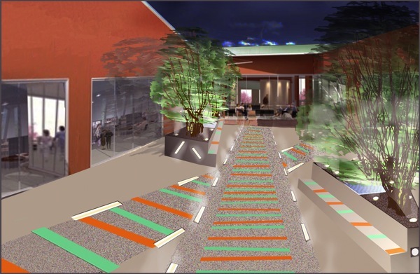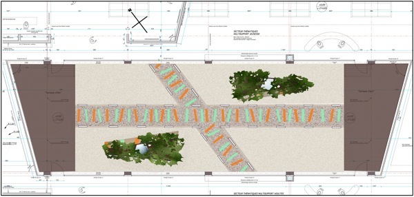 Ma proposition reposait sur la symbolisation de deux voies ferrées (clin d’œil à l’histoire du quartier), l’une situé au milieu du patio et reliant les deux terrasses, l’autre la croisant en son centre mais précisément orientée nord-sud (repère dans l’espace, en relation avec l’extérieur du bâtiment).