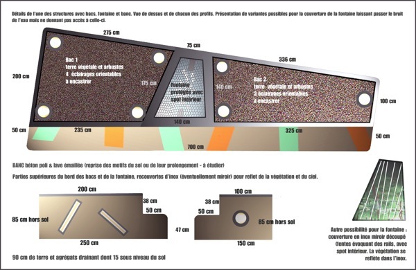 Ces structures, dont la forme rappelait celle des terrasses, étaient éclairées par des projecteurs orientables encastrés dans les bacs et par des lumières longues (pour leur extrémité la plus large).