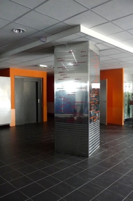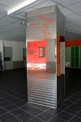 Deuxième élément : le pilier du secteur vie scolaire porte l’affichage du code explicatif de la représentation des communes (nom et numéro de chacune) telles qu’elles apparaissent sur les deux autres parties de l’œuvre. Le pilier carré, dont chaque face est précisément orientée, offre la clef de lecture des deux autres interventions. Aubenas, qui comprend le collège, se situe en bas de chaque face.