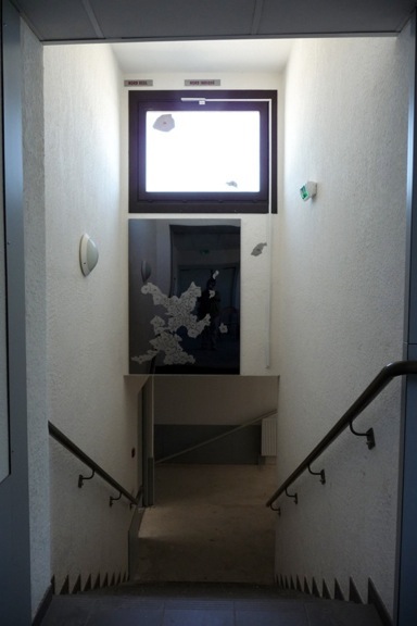 Troisième élément : dans l’escalier de la SEGPA, la descente permet de regarder en face, et la montée appelle à se retourner vers la lumière. Sous la fenêtre donnant à voir le ciel, un miroir sombre (inox ti-black) avec une silhouette morcelée au centre, reflète tout ce qui se meut. Cette silhouette représente une véritable carte des communes dont chacune est numérotée. Mêmes numéros que dans le patio et sur le pilier. Mais ici, le tableau n’est pas vraiment orienté : on peut observer que le nord conventionnellement indiqué pour lire la carte n’est pas le nord réel inscrit plus à gauche. La présence de cette carte miroir met en valeur les jeux de lumière sur les ombres qui passent et interroge les repères.