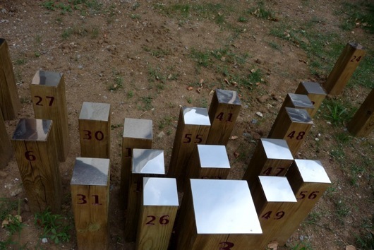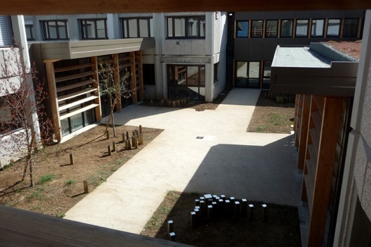 Premier élément : dans le patio fermé à tout horizon mais ouvert sur le ciel, je propose de voir l’extérieur de l’intérieur, par l’implantation, sur les espaces végétalisés, de 4 groupes de potelets en bois recouverts d’une plaque d’inox miroir et représentant chacun une commune du bassin de population du collège. Chaque groupe étant parfaitement orienté (N, S, E ou O), toutes les communes sont matérialisées deux fois (au sud OU au nord, ET à l’ouest OU à l’est) et prennent place autour de la commune d’Aubenas où se situe le collège (potelet plus gros que l’on retrouve 4 fois), avec l’orientation et les distances exactes ramenées à l’espace du patio.