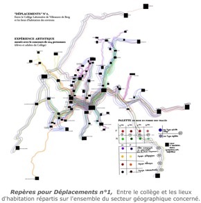 L’idée de départ était de découvrir la manière dont les déplacements, au cours d’une même journée, de toutes les personnes fréquentant le collège, pouvaient révéler l’organisation des espaces interne et externe à celui-ci et l’existence de comportements individuels plus ou moins partagés. Ces déplacements matérialisés par des lignes devaient permettre d’appréhender chaque territoire (le collège, la ville et l’ensemble du secteur géographique relatif à ce collège) comme un espace-temps défini par les énergies circulantes.