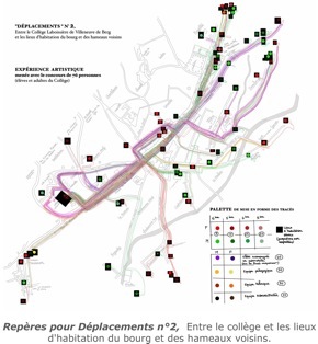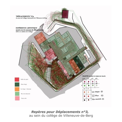 Il s’agira en effet de rendre visible l’organisation interne d’un espace architectural (celui du Collège) et la façon dont celui-ci s’insère dans un environnement naturel et construit (son « secteur » géographique et social), à travers le repérage et la matérialisation plastique (principalement tracés et couleurs) des circulations de toutes les personnes qui fréquentent le Collège, au cours d’une seule et même journée scolaire. »